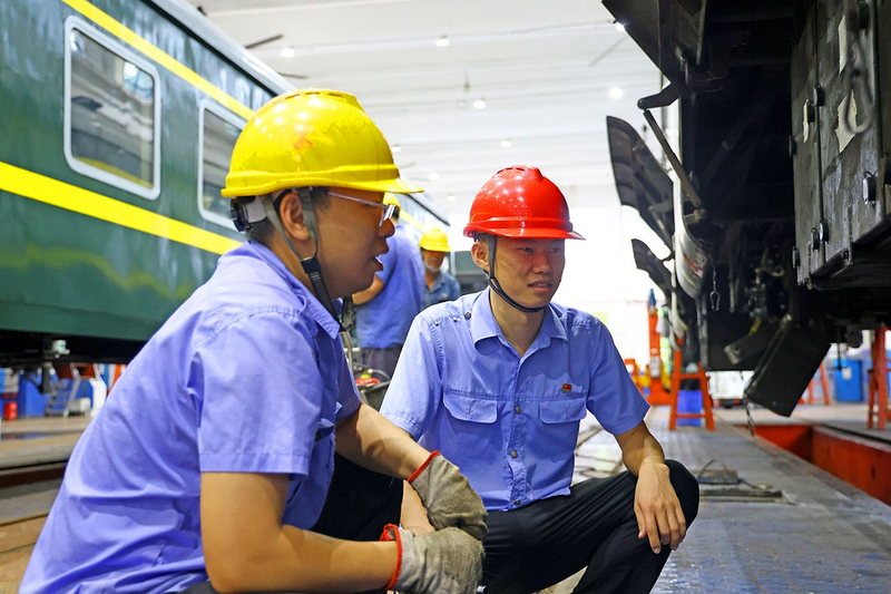 冯其林(右)在车辆检修现场指导作业。 赵诗霖 摄 秋日南宁,热浪未消。在南宁车辆段段部检修库内,一列列旅客列车静待“体检”。