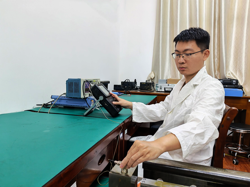 国庆、中秋假日期间,质监所安排力量校准送检仪器,为运输一线提供合格仪器。图为质监所检定人员校准钢轨探伤仪。 谭东坡 摄