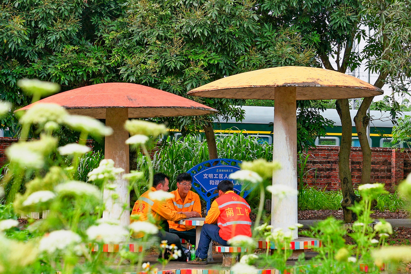 南宁工务段持续推进“三线”建设,职工积极参与建设美好家园,进一步增强职工的归属感与幸福感。图为近日,该段职工工余时间在工区凉亭休息。 韦 刚 摄