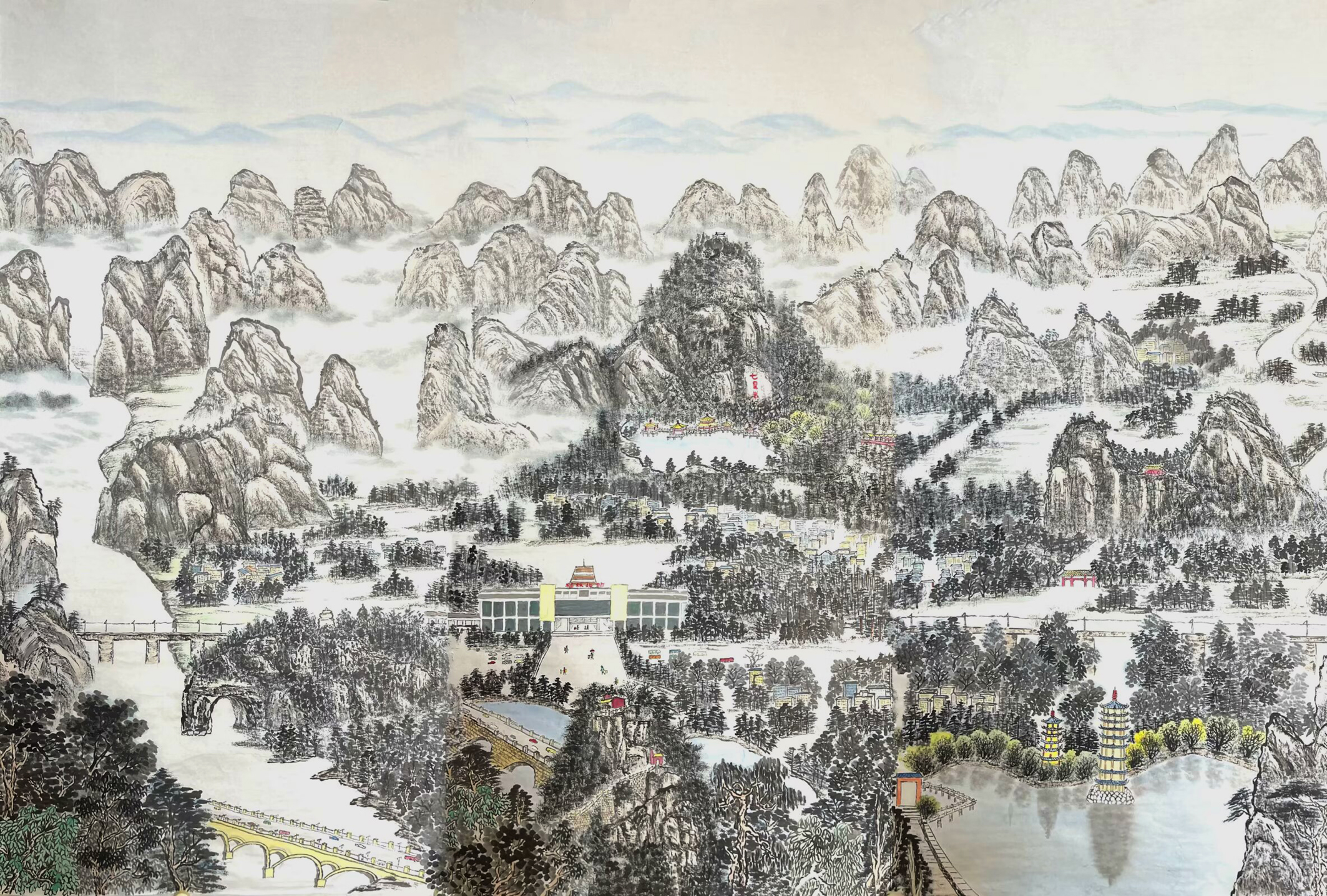 一个个不同的车站和当地各异的山水景观,在王建设的笔下,同时同框,没有空间和时间的限制。虚实结合,精华浓缩,让人一图尽览美景。清山秀水为铁路车站增色添彩,铁路车站让清山秀水有了烟火人气。